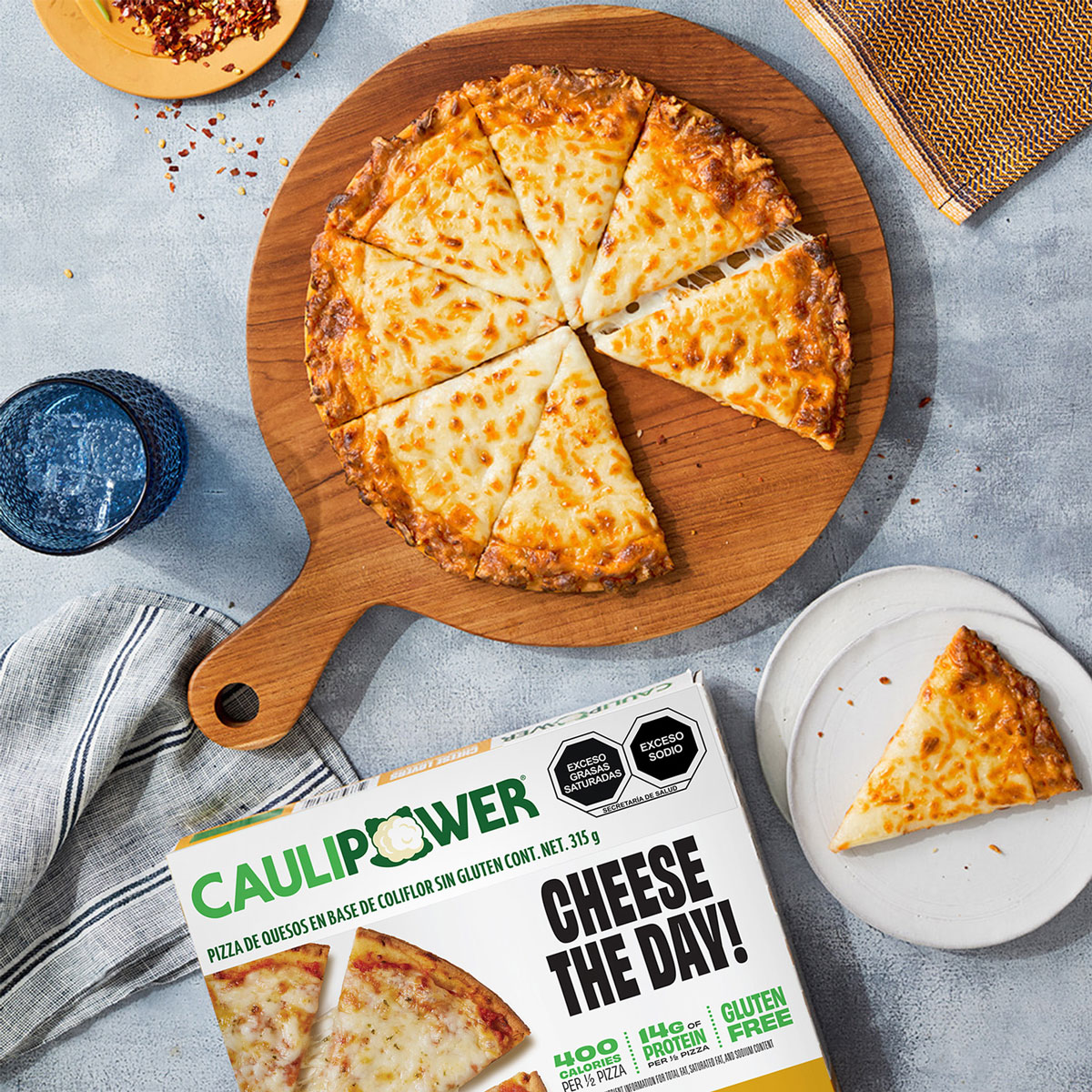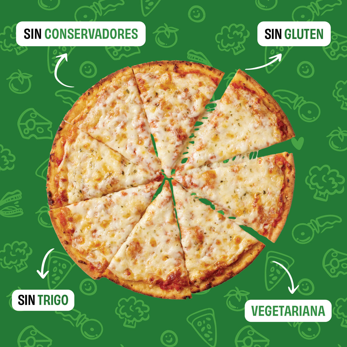 Masa (coliflor, harina de arroz integral, harina de arroz blanco, agua, almidón (maíz, tapioca), aceite vegetal, huevo, polvo para hornear (pirofosfato ácido de sodio, bicarbonato de sodio, almidón, fosfato monocálcico) goma xantana, azúcares añadidos (azúcar), levadura, vinagre, sal yodada), salsa (agua, pasta de tomate, sazonador (ajo en polvo, especias, cebolla), sal yodada, albahaca (Ocimum basilicum)), queso mozzarella parcialmente descremado (leche parcialmente descremada pasteurizada, cultivos lácticos, sal yodada, enzimas), queso fontina (leche pasteurizada, cultivos lácticos, sal yodada, enzimas), queso provolone (leche pasteurizada, cultivos lácticos, sal yodada, enzimas), queso parmesano, romano y asiago (leche parcialmente descremada pasteurizada, cultivos lácticos, sal, enzimas), perejil. Contiene leche y huevo.