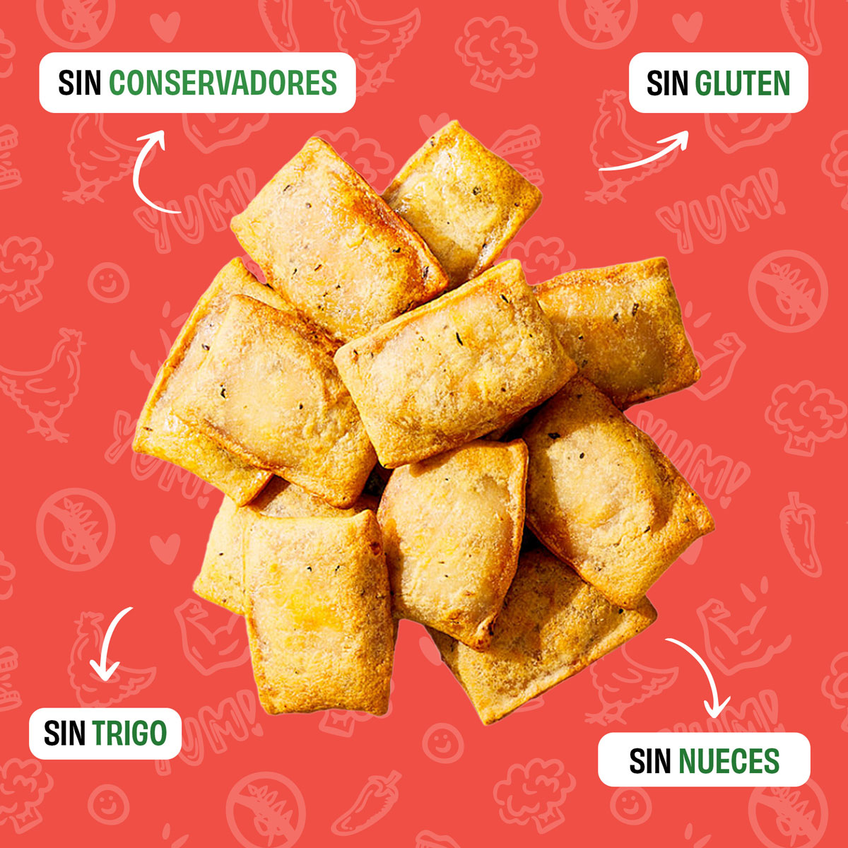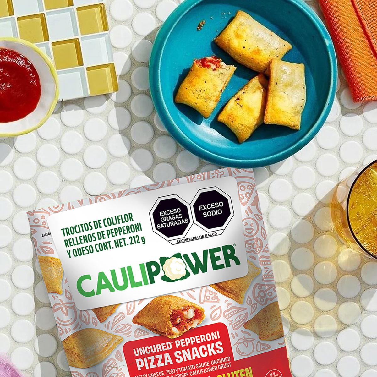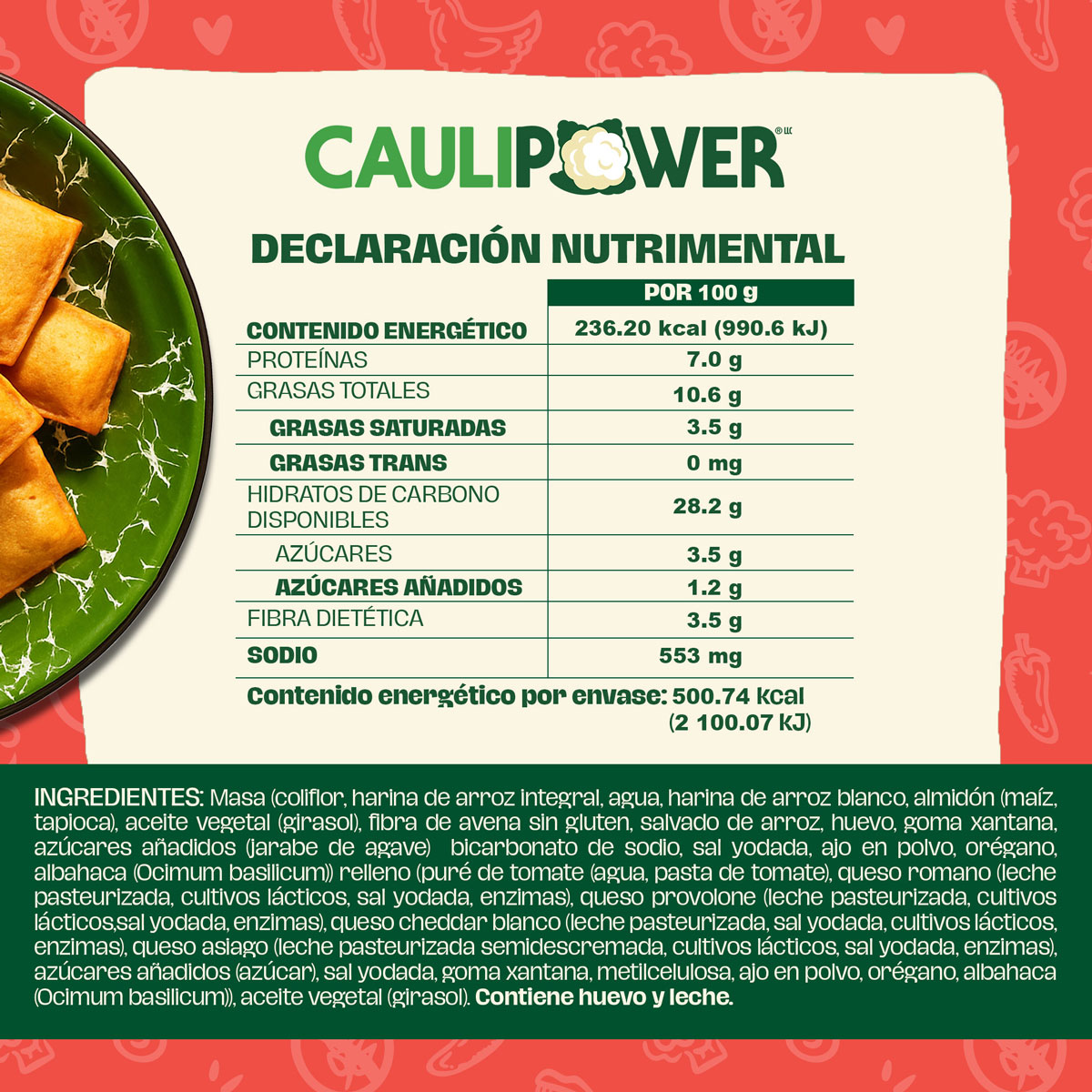 Masa (coliflor, harina de arroz integral, agua, harina de arroz blanco, almidón (maíz, tapioca), aceite vegetal (girasol), fibra de avena sin gluten, salvado de arroz, huevo, goma xantana, azúcares añadidos larabe de agave) bicarbonato de sodio, sal yodada, ajo en polvo, orégano, albahaca (Ocimum basilicum)) relleno (puré de tomate (agua, pasta de tomate), queso romano (leche pasteurizada, cultivos lácticos, sal yodada, enzimas), queso provolone (leche pasteurizada, cultivos lácticos,sal yodada, enzimas), queso cheddar blanco (leche pasteurizada, sal yodada, cultivos lácticos, enzimas), queso asiago (leche pasteurizada semidescremada, cultivos lácticos, sal yodada, enzimas), azúcares añadidos (azúcar), sal yodada, goma xantana, metilcelulosa, ajo en polvo, orégano, albahaca